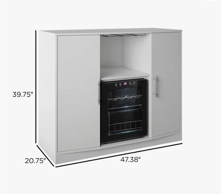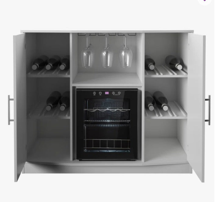 Une armoire/bar blanche avec refroidisseur réfrigéré intégré, idéale pour salon, salle à manger ou espace de réception. Elle combine rangement, style et une zone de refroidissement pour boissons et bouteilles.